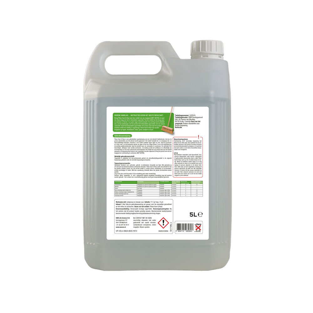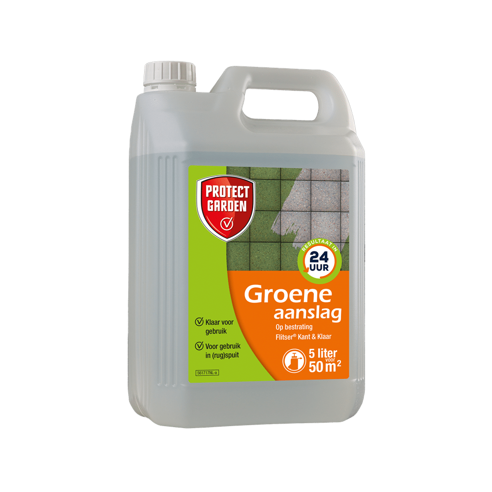Met Flitser Kant & Klaar ALG verwijder je snel en eenvoudig groene aanslag van terras, oprit en tuinpaden. Het product werkt al binnen 24 uur en is direct gebruiksklaar. Met deze 5 liter verpakking behandel je tot wel 50 m² oppervlak. Aanbrengen gaat gemakkelijk met een (rug)spuit.